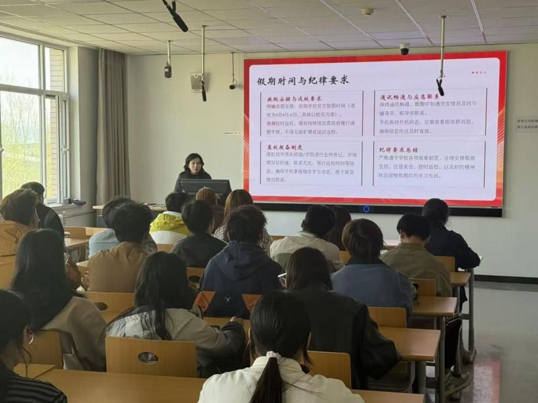 结合清明节假期安排,班会重点部署安全与纪律要求,强调按时返校,严格执行离校去向登记以及请销假制度,确保通讯畅通。同时,从出行、祭扫、宿舍、财产、健康等五个方面细化安全提示,筑牢假期安全屏障,助力师生度过平安、文明、有意义的假期。