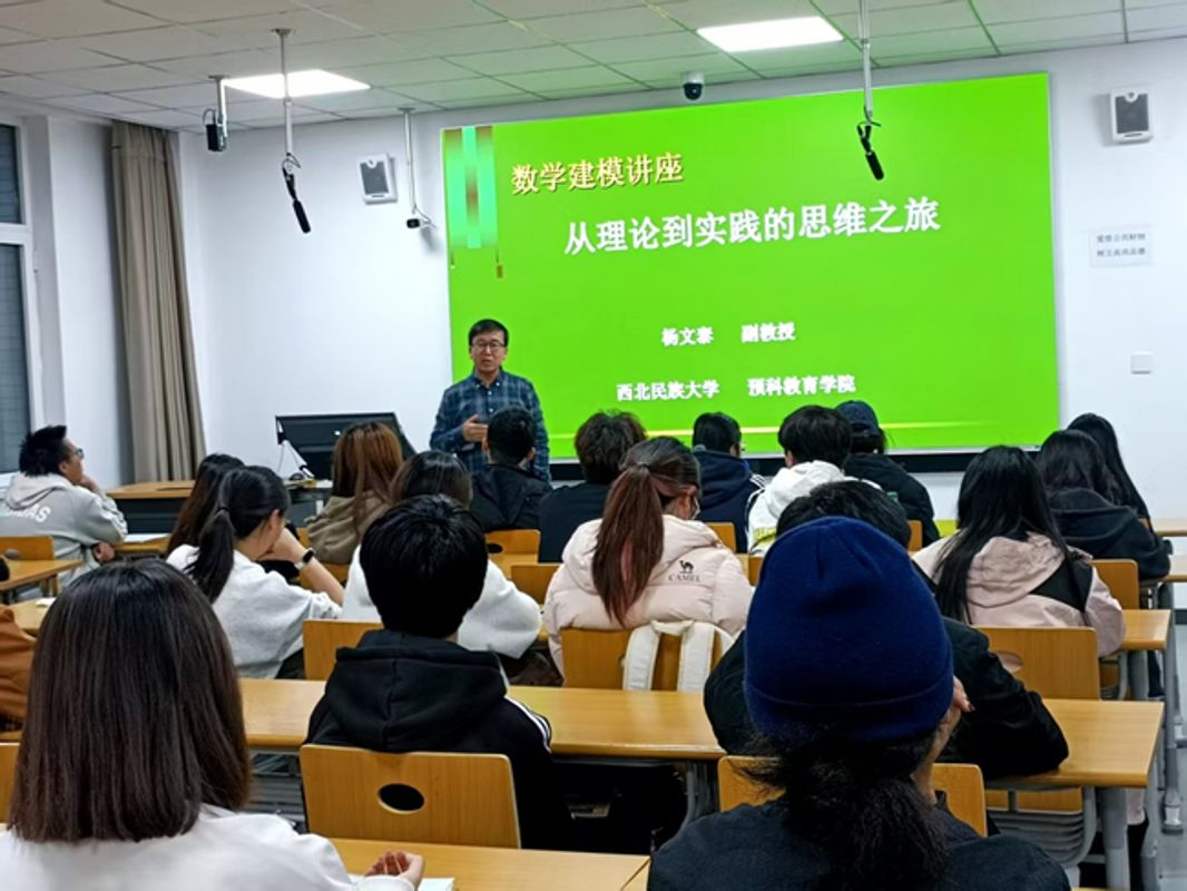 2026年4月8日晚,预科教育学院《从理论到实践的思维之旅》数学建模专题讲座在博雅楼210教室开讲。杨文泰老师为全院文理科学子50余人呈上一场既具理论深度又兼具实践教学的学术盛宴。此次讲座是学院推进新时代预科数学实践性教学的关键一环,更是深化教学改革、赋能预科人才培养的生动落笔。