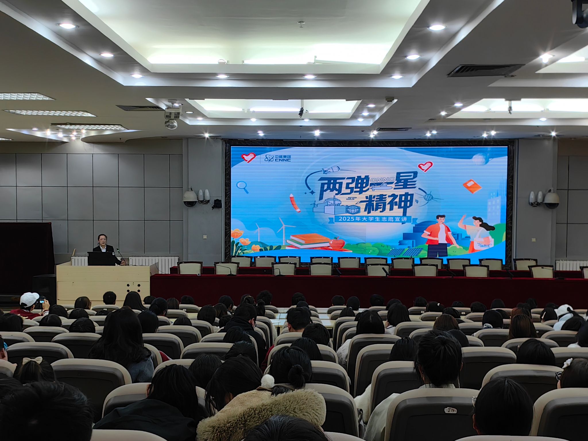 互动问答环节气氛热烈,宣讲团围绕原子弹爆炸时间、地点及科学家事迹等知识点出题,学子们积极抢答,在趣味互动中深化了对 “两弹一星”精神的感悟。