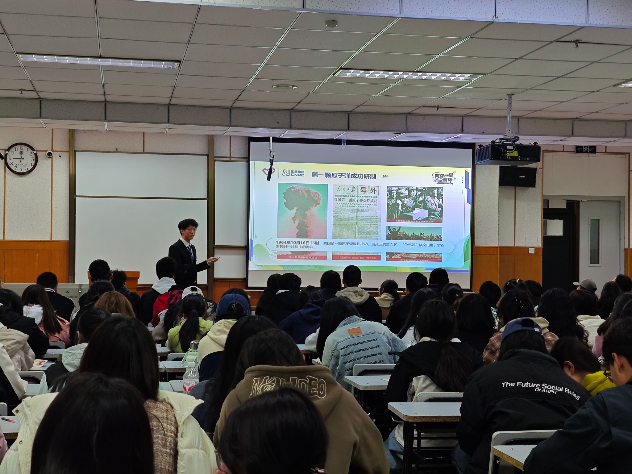 本次宣讲由宣讲团成员娄煜婷、程泽凯主讲。宣讲伊始,一段精心准备的“两弹一星”知识科普小视频拉开活动序幕,生动再现了我国第一颗原子弹、氢弹成功研制的光辉历程,让在场学子直观感受那段艰苦卓绝又热血沸腾的岁月。