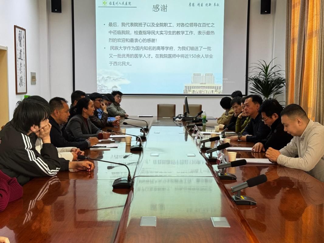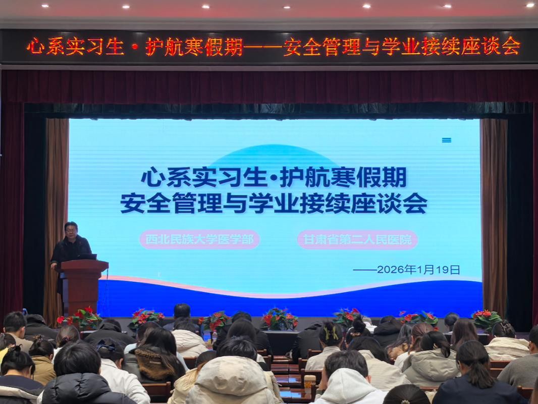 1月19日,医学部党委书记郭力、党委副书记马鸿波带队,先后前往了甘肃省第二人民医院、联勤保障部队第九四〇医院、甘肃省中心医院及临夏州医院等多家教学单位,面向全体实习生集中开展寒假期间安全、纪律与就业规划专项指导工作。医学部学生管理办公室副主任努尔妮萨、辅导员马彬参加活动。