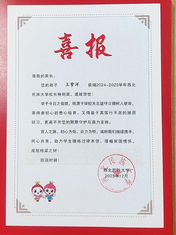 近日,西北民族大学医学部为35名荣获2024-2025学年国家奖学金与校长特别奖的学生家长寄送喜报,这是医学部落实立德树人根本任务、深化家校共育的重要实践。喜报不仅传递了学生成长的喜悦,更搭建起家校沟通的桥梁,凝聚起“学校精心培育、家庭全力支持、学生自我奋进”的育人合力,助力医学人才在“健康中国”征程中茁壮成长。