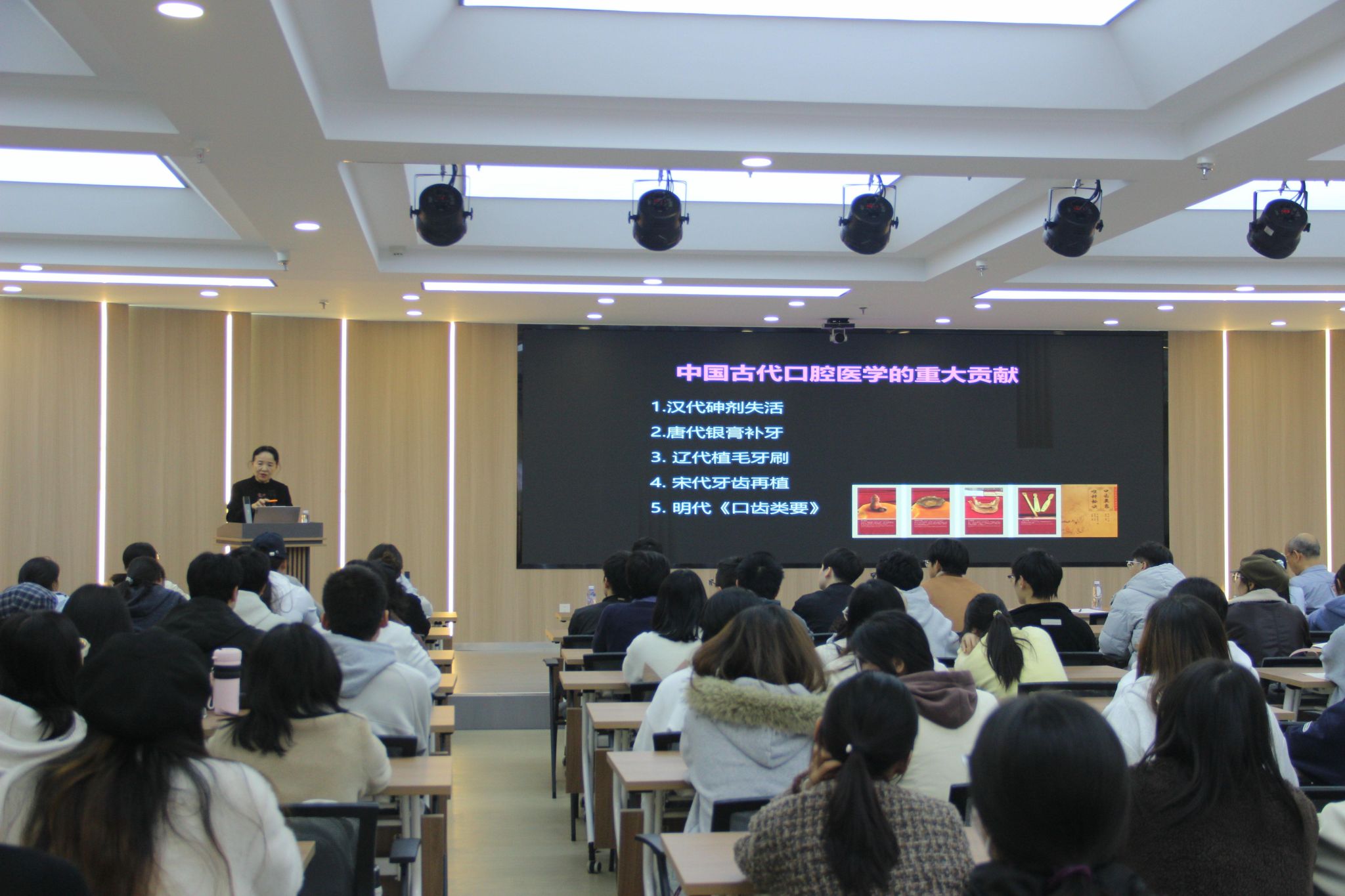 周学东教授从口腔医学的起源为切入点,介绍了口腔医学学科的发展始末,从“牙痛之神”讲到世界第一个牙学院,从“笑气”到乙醚麻醉,深入浅出地讲述了口腔医学如何从国外的“街头游走职业”发展到世界专业性学科,并从中国古代口腔医学发展历程,展示了灿烂中国古代文明。从人类四次工业革命讲起,并详细阐述了AI医疗新时代人工智能和口腔健康管理,最后鼓励同学们要积极了解前沿,始终保持学习的习惯,成为优秀的口腔医务工作者。