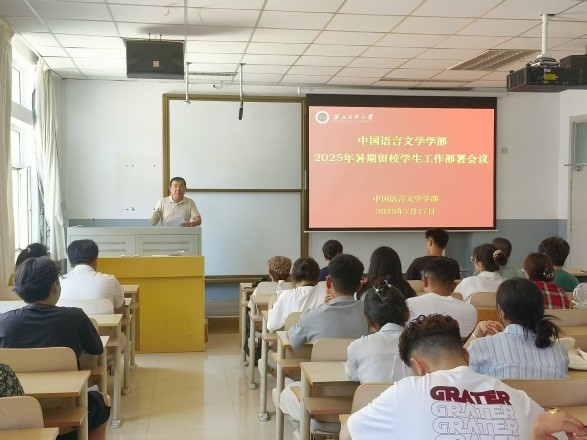 为扎实做好暑期留校学生服务保障工作,切实筑牢留校学生安全防线,7 月 17 日,中国语言文学学部在致美楼202教室召开 2025 年暑期留校学生工作部署会议,学部常务副书记马鸿波、辅导员吉日嘎拉图及全体暑期留校学生参会。