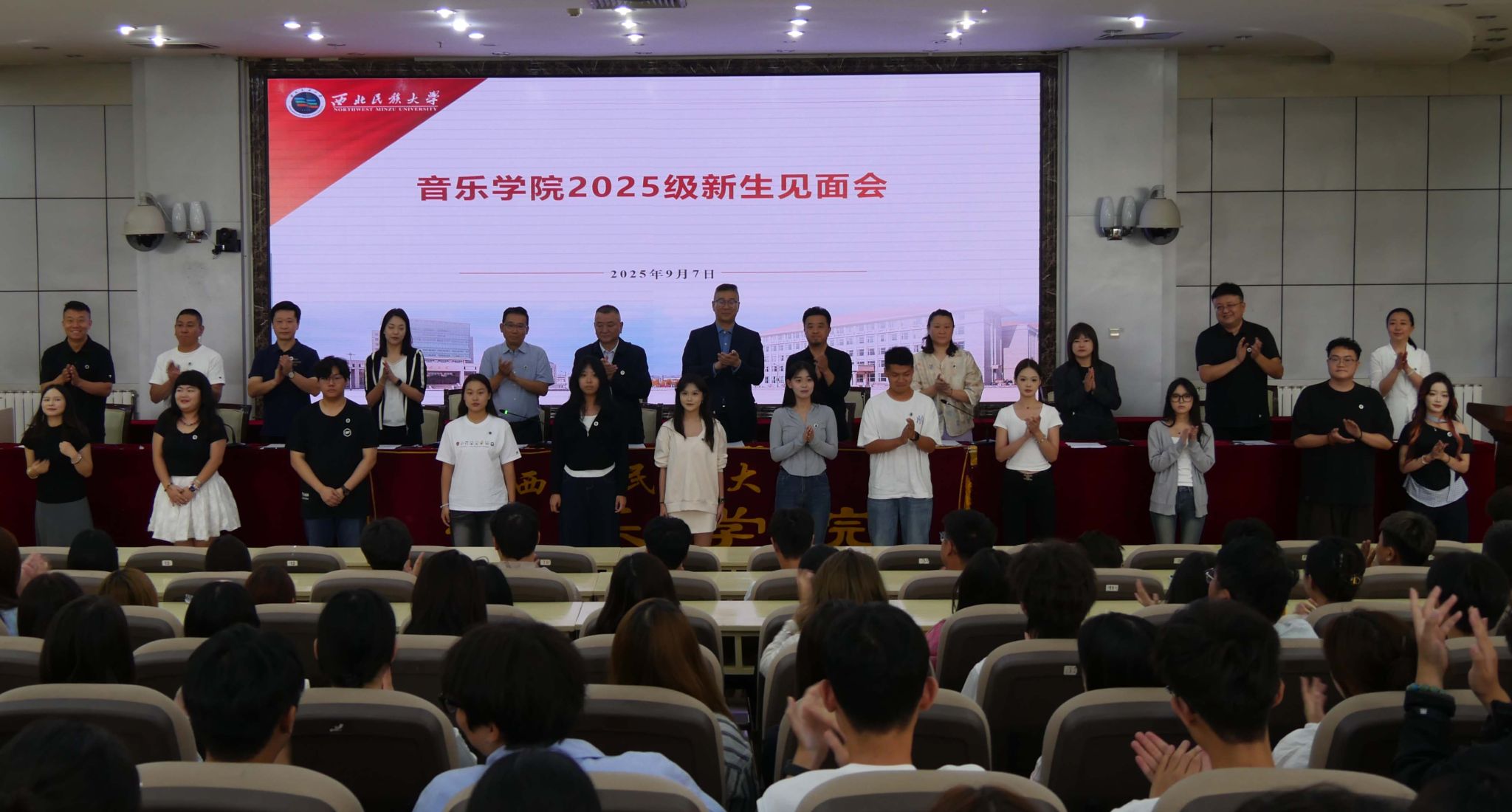 见面会以庄严的国歌奏响序幕,全体参会人员起立高唱中华人民共和国国歌。国歌结束后,院长赛音上台致辞。他向新生们介绍了学院74年的办学历程,从早期的专业建设到如今的学科发展,细数学院在音乐教育领域的积累与突破;同时提及多位优秀校友,用真实案例让新生感受到学院的育人实力。最后,院长对新生提出希望:“希望大家能扎根专业学习,多听多练多思考,既要传承音乐文脉,也要涵养艺术情怀,在学院找到属于自己的音乐成长之路。”