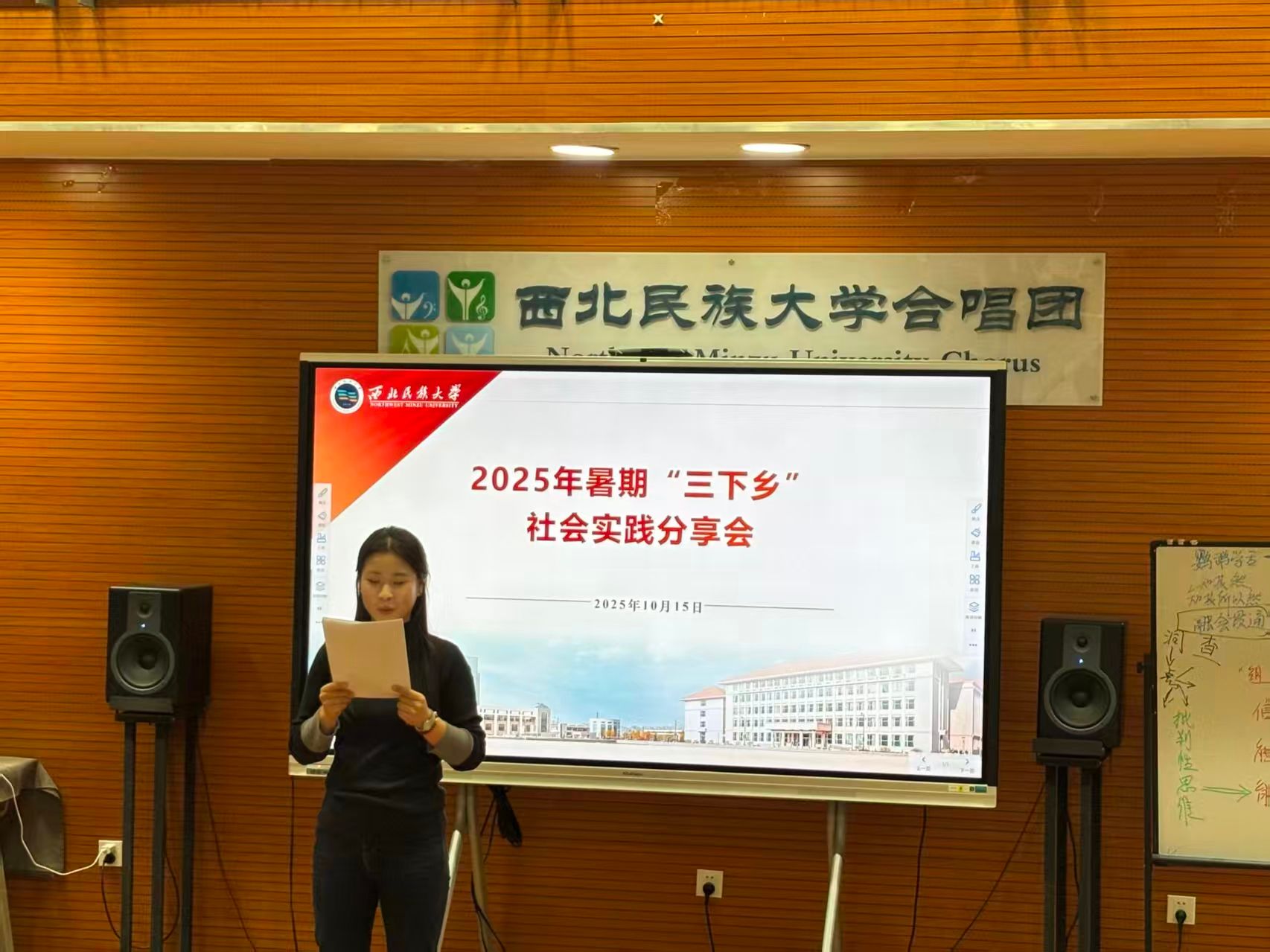 2025年10月15日晚七点三十分,学院在合唱排练厅举行暑期“三下乡”社会实践分享会,三支实践团队依次作分享报告,师生齐聚现场,共同回顾实践历程。