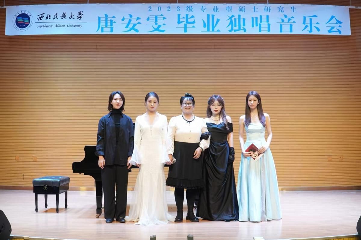 2025年11月11日15:30,2023级专业型硕士研究生唐安雯成功举办毕业独唱音乐会。 整场音乐会历时一个小时,共唱了《渴望春天》《深深吻我》《我心花怒放》《落叶》《生死相依我苦恋着你》《赤子情》等十二首作品,其中外国作品四首,中国作品八首。 参加本场音乐会的评委老师有常虹老师、杨扬老师、何英琴老师。本次音乐会艺术指导由张金松老师担任,主持人宋盼盼。
