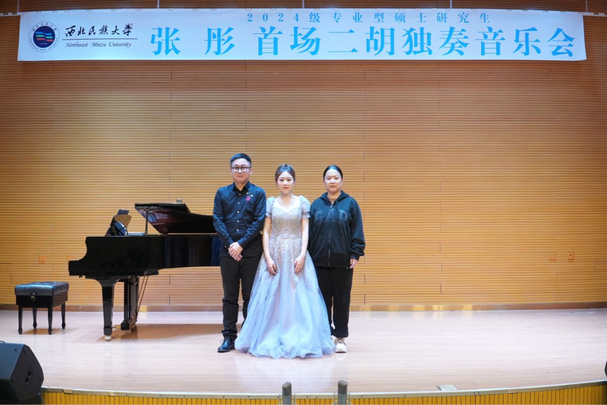 2025年11月18日上午9点,2024级专业型硕士研究生张彤成功举办首场二胡独奏音乐会。 参加本场音乐会的评委老师有阚鹏、管民、王洁。整场音乐会历时一个小时,共演奏了《豫北叙事曲》《火—彩衣姑娘》《新婚别》《长城随想三、四乐章》四首作品,其中传统曲目两首,当代曲目一首,二胡协奏曲一首。 本次音乐会艺术指导史洋老师,主持人罗晨明。