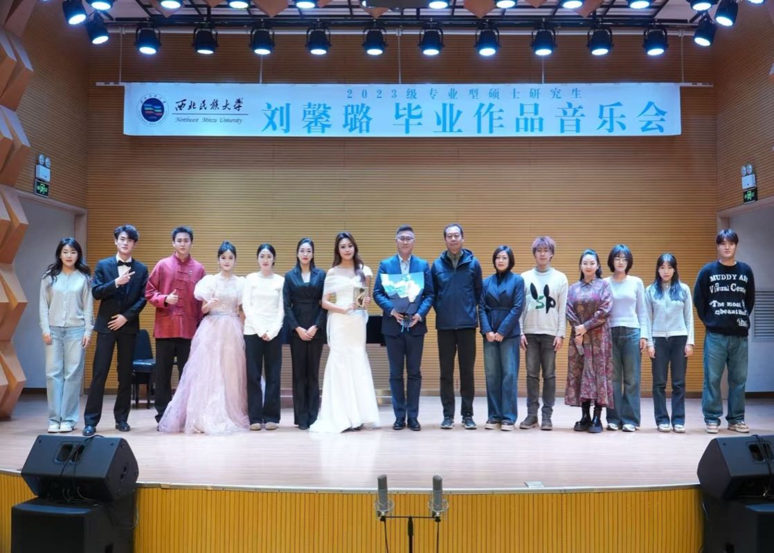 2025年10月19日16:30,2023级专业型硕士研究生刘馨璐成功举办毕业作品音乐会。 整场音乐会历时1小时,共七首作品,其中上半场均为声乐作品分别为《传衣古松》《依恋敦煌》《雪落》《好日子唱着过》;下半场均为器乐作品,分别为小提琴与钢琴协奏曲《云水行吟》、弦乐四重奏《暇间浮梦》、器乐重奏《欢阙》。 本场音乐会艺术指导刘一芃老师,主持人刘馨璐。张蕾、王珊、黄炜三位老师担任评委。